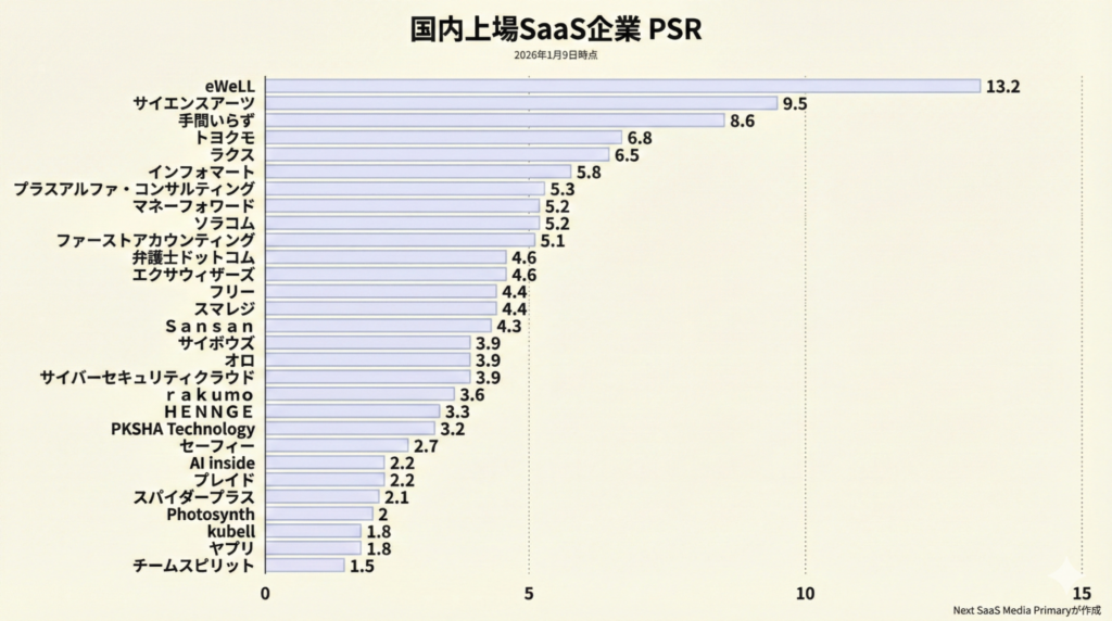 PSR上位には、マネーフォワードやフリーといった従来先行投資を行ってきたスタートアップ型のSaaSではなく、eWeLLや手間いらず、ラクスやプラスアルファ・コンサルティングなど安定的に成長しつつも、利益を出している企業が並んでいます。